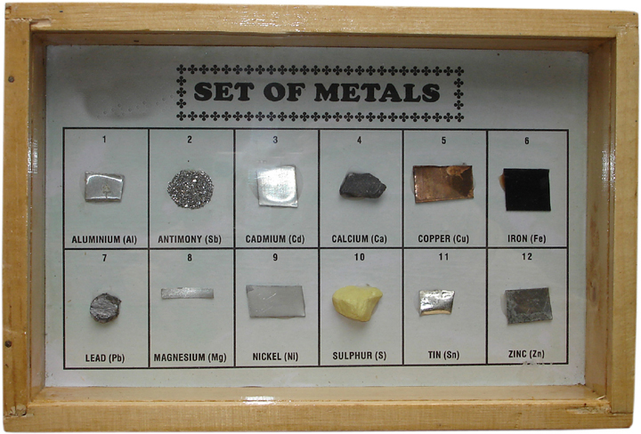 This Collection contains 12 Types of Basic Metals Specimens. The Metal Specimens include Some of the following Aluminium (Al), Antimony (Sb), Cadmium (Cd), Calcium (Ca), Copper (Cu), Iron (Fe), Lead (Pb), Magnesium (Mg), Nickel (Ni), Sulphur (S), Tin (Sn) & Zinc (Zn) Etc.